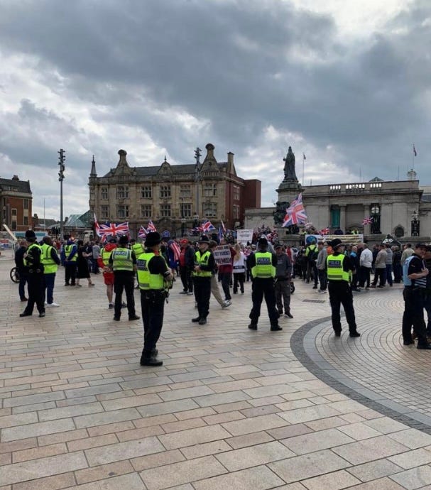 Until then, the Together for the Children rally was going much the way of previous anti-migrant rallies led by John Francis Gilling, the organiser of last year’s Stop the Boats rally which triggered prolonged violent rioting in Hull city centre and led to dozens of arrests and prison sentences.